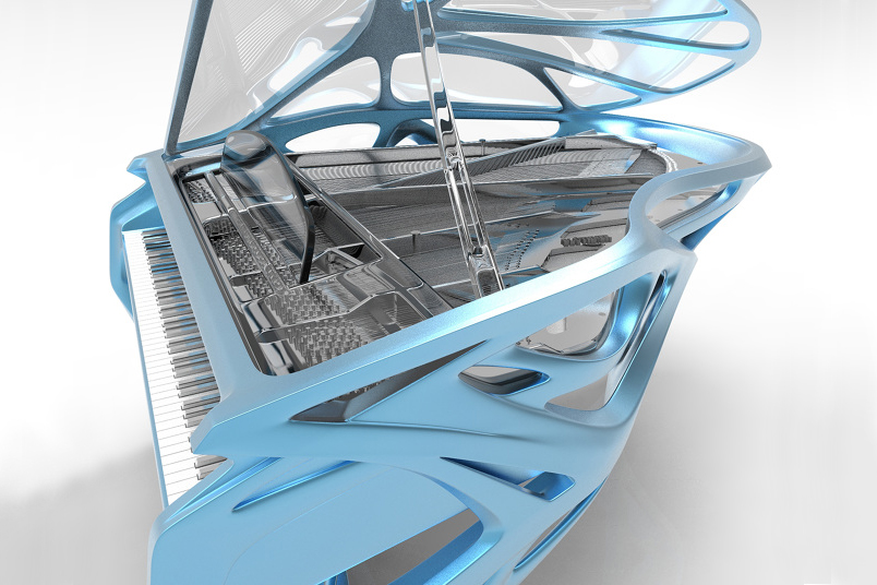 EXO - The quintessence of futuristic piano design and craftsmanship, featuring MONAD Studio's signature 3D forms escorted by Blüthner's Golden Tone. The radical three-dimensionality of the EXO creates a sense of futuristic opulence highlighted by the seamless, fluid elegance of the sculptural exoskeleton that frames the grand piano's instrumental core. Its radical morphology invokes a sense of arresting elegance, blending cutting-edge 3D technology with Blüthner Pianoforte Fabrik's sonic expertise.